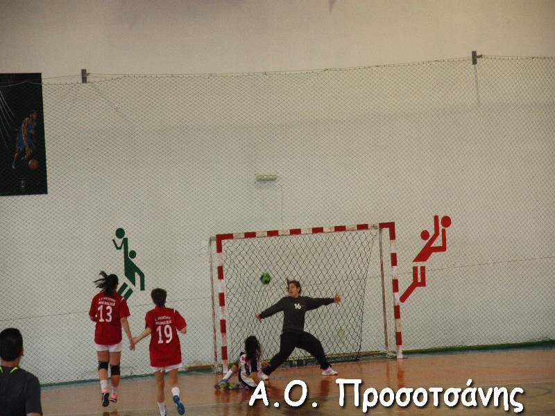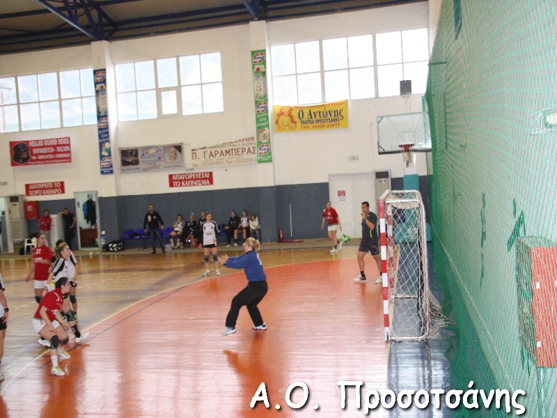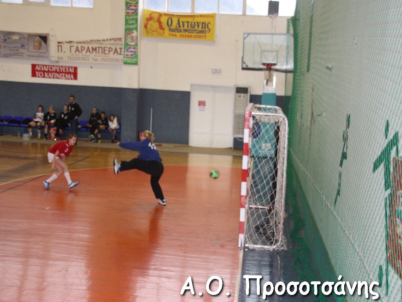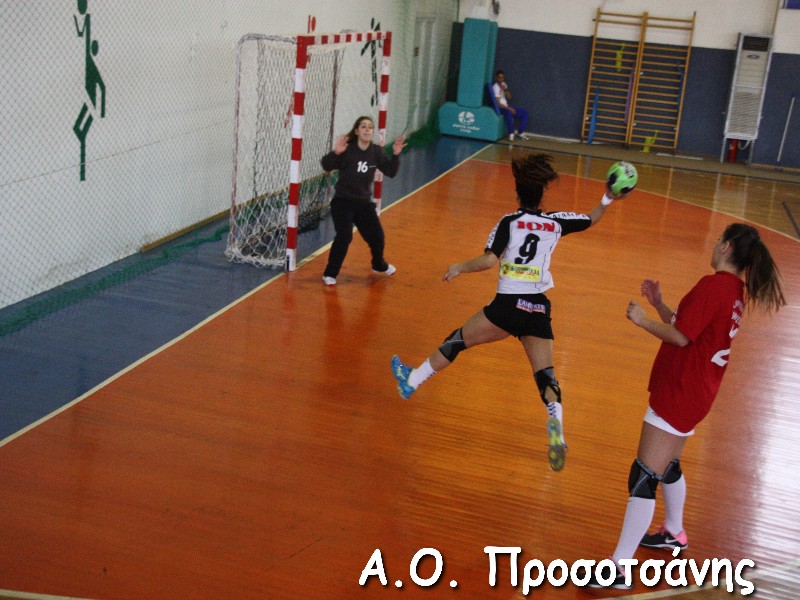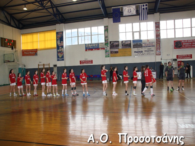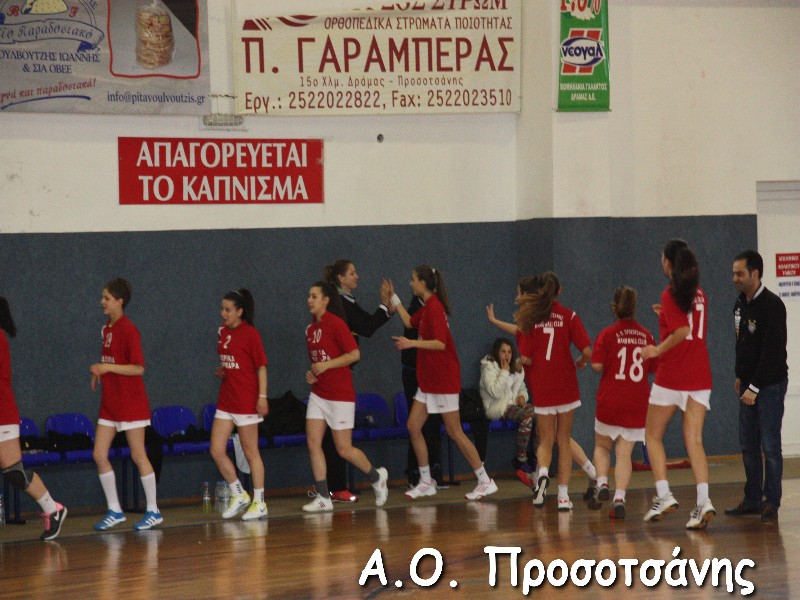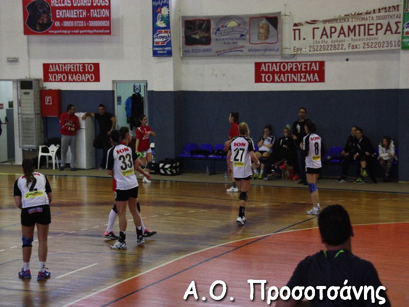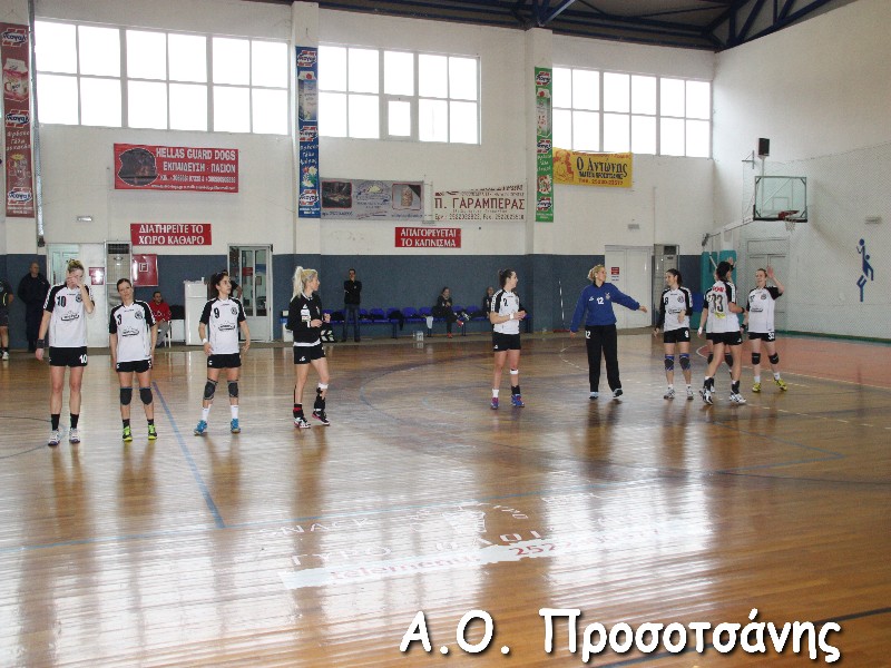 Οι νεαρές αθλήτριες το Α.Ο. Προσοτσάνης, μ.ο. ηλικίας 17, στάθηκαν επάξια απέναντι στις υποψήφιες πρωταθλήτριες Ελλάδος και υποψήφιες κυπελλούχες πλέον. Το παιχνίδι για ένα ημίχρονο ήταν πραγματικό ντέρμπι, με τις δύο ομάδες να συμβαδίζουν στα τέρματα και να κλείνει το ημίχρονο με την φιλοξενούμενη ομάδα να προηγείται 16-18.